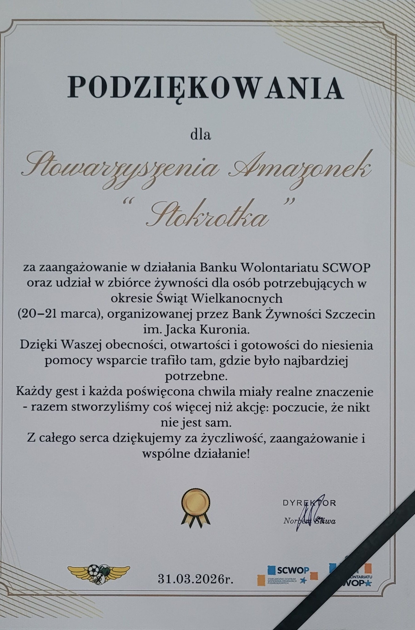 W trakcie spotkania z rąk Dyrektora DKKOL Pana Norberta Śliwa otrzymaliśmy piękne podziękowania za udział w zbiórce żywności.